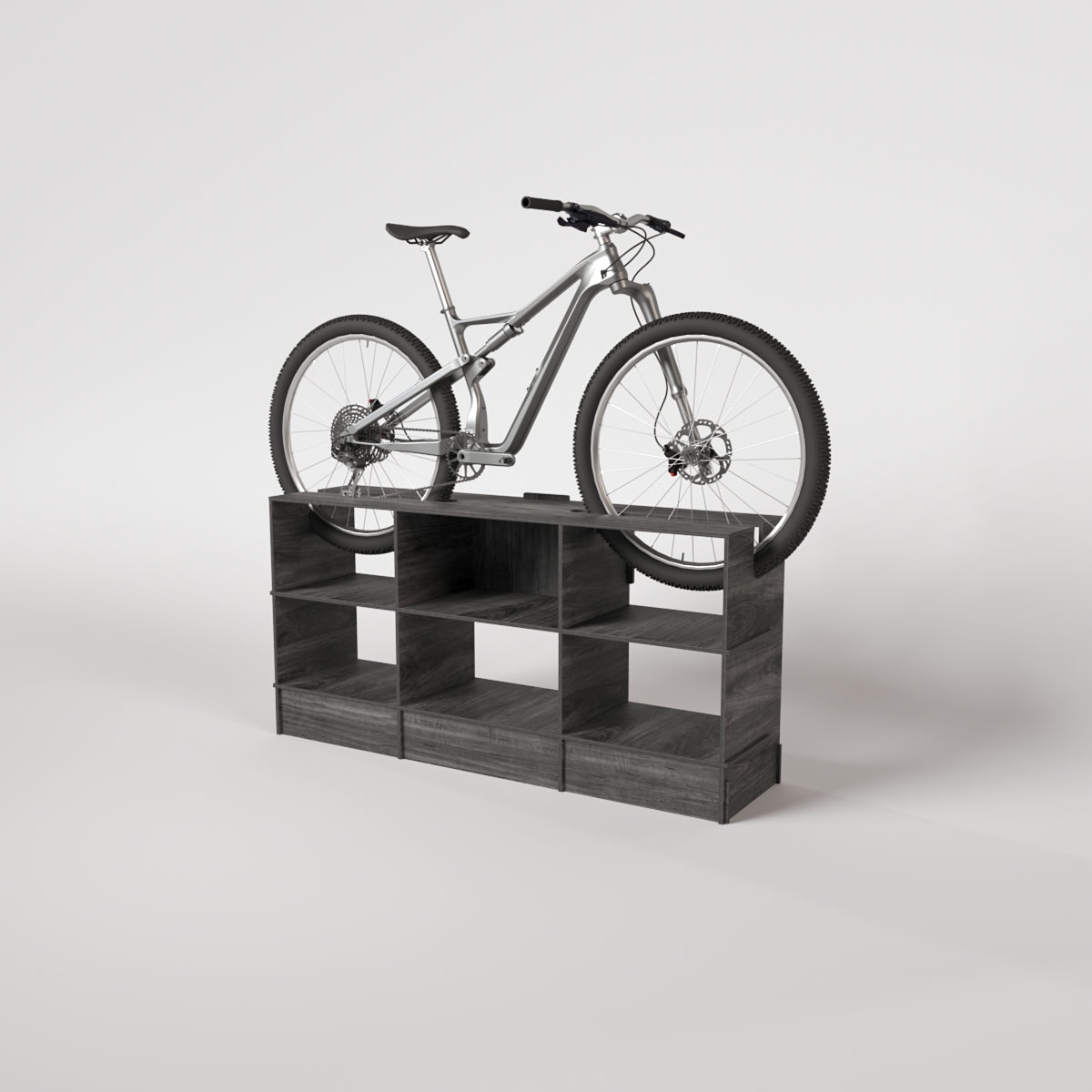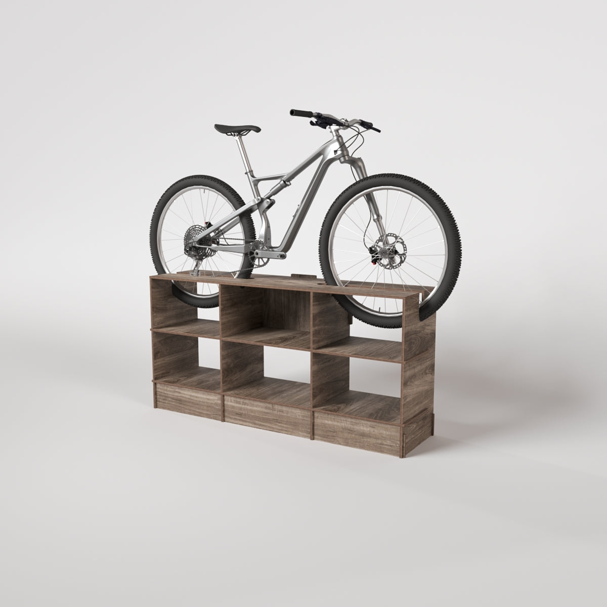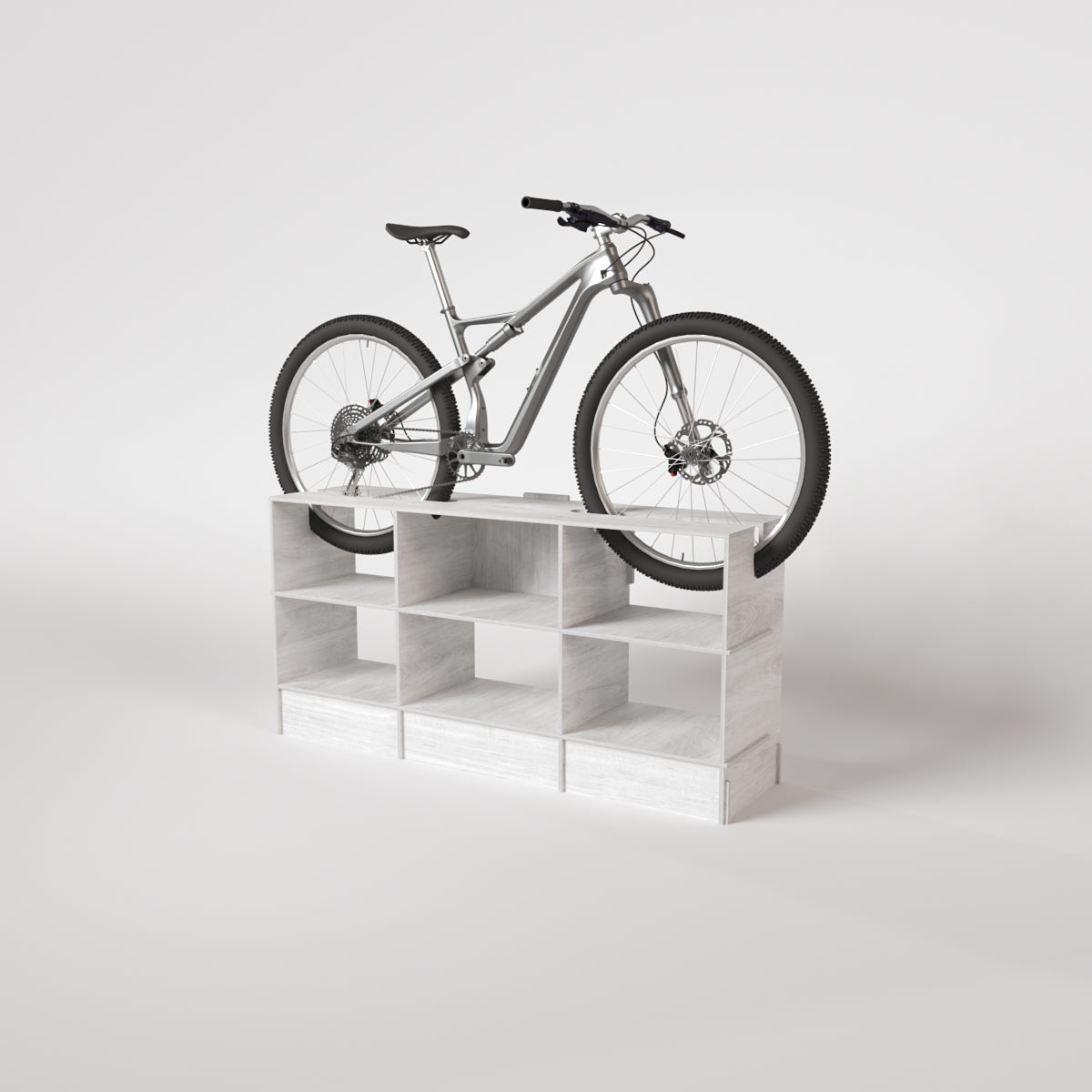 Merging a classic bookshelf form with the functionality of a bike stand Arrimo integrates seamlessly into your lifestyle. Arrimo maximizes functionality by providing ample storage space while also positioning your bike at the perfect height for cleaning and maintenance.